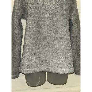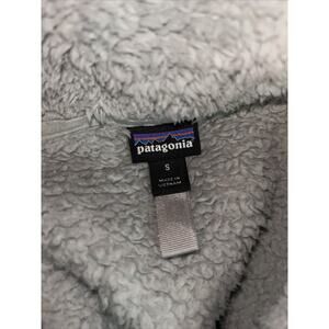 Patagonia solid lighter gray sherpa fuzzy fleece long sleeve 1/4 zip pullover sweatshirt. Features fold down or stand up collar atop 1/4 length plastic zip closure at center front. Zipper extends into collar. Long straight cut sleeves. Patagonia logo patch at left breast. Cut straight through body length, falling to mid hip. Traditional sweatshirt weight fabric with soft fuzzy sheep fleece finish. Stretch available. Womens size small with 41” unstretched bust measurement and 25.5” from shoulder top to bottom hem. EUC. Win a few times. Recently cleaned and spotless