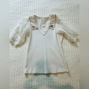 NWT Anthropologie Blouse with puff sleeve and embroidered collar size Small, body is a ribbed knit material (97% Cotton, 3% Elastane)