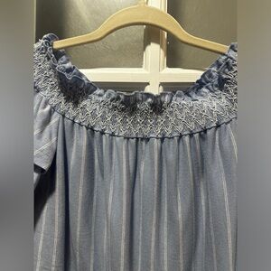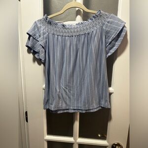 American Eagle Off The Shoulder Ruffle Sleeve Top. Powder blue with pretty pattern around the collar. Would pair great with jeans. Size small.