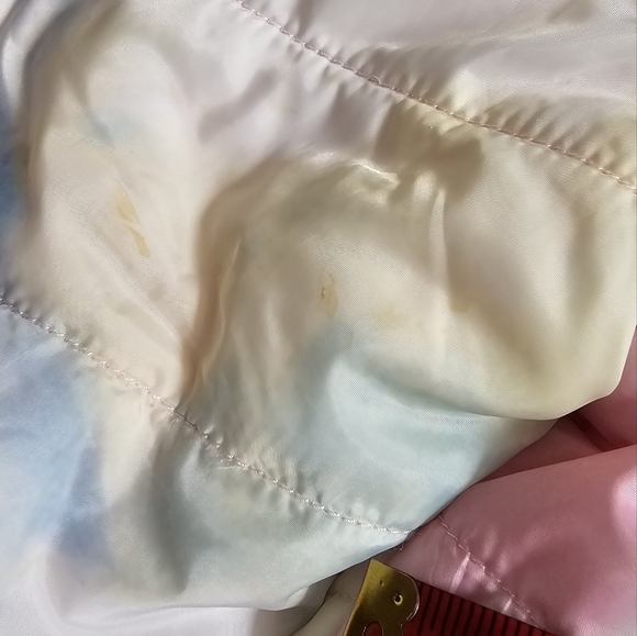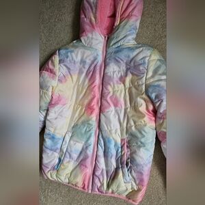 Great condition little girl's puffer winter coat. Polyester, faux fur pink on one side and tie dye on the other.