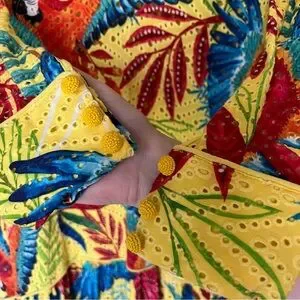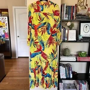 This Farm Rio yellow dress is in great used condition. The dress is size small. This dress has beaded button details on the sleeves and comes with a yellow slip. The yellow slip does have a few light marks on it. Please let me know if you have any questions.