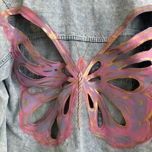Cute and casual denim jacket with a distressed butterfly back. The butterfly is sparkly, and the vinyl wings of the butterfly are painted pink, purple, blue, and gold.