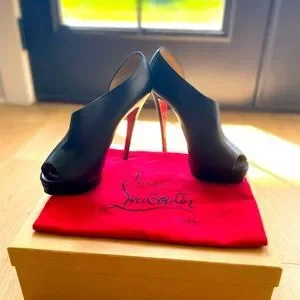 38.5 black leather with a 5” heel. Comes with dust bag and box. Only worn a few times. @trolleywood
