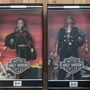 Up for sale is this Collector Edition bundle of the 1999 Harley-Davidson Barbie and Ken with a 1999 Harley-Davidson Softail / Fatboy. All three are new in box collectibles and have been securely stored in a smoke free, dust free, dry environment for the past 25 years. They are in excellent condition, with only a small blemish visible on the bottom left of the rear of the motorcycle box. Not tears, just two small, 1/4" dents. See photo and the rest of the photos, to confirm the pristine condition of these three bundled items. These were purchased separately and never opened or removed from their original manufacturer containers. They will truly enhance your Barbie and Harley-Davidson collectibles. UPDATE: Price reduced by 12%.