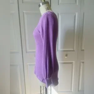 Essential Oversize Sweater in Orchid by Elhoffer Design, size XS/S (but comfortably fits M/L sizes for a more fitted look). Boatneck Neckline with bishop sleeves with thumbholes in the cuffs. Hi-Low hem and oversized hourglass body fit. Made from Acrylic/Rayon/Polyester/Spandex yarn knit, some minor pilling and one thread snag on the sleeve from previous wear (pictured). Has since been thoroughly cleaned and gently stored in a smoke-free home.