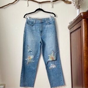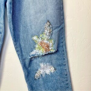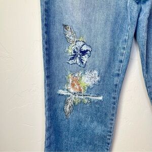 Floral embroidery on each knee with distressing