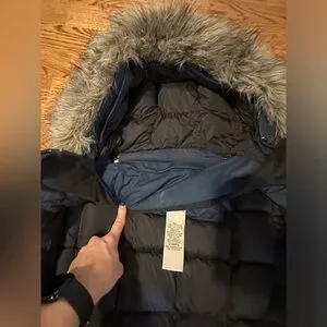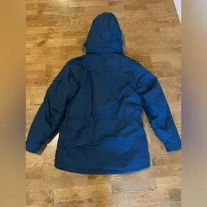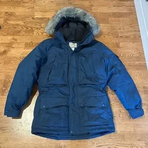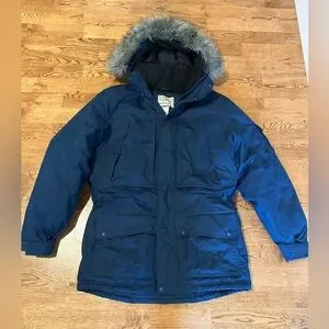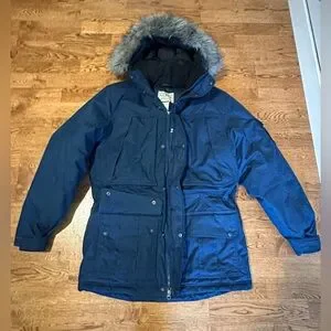 LL Bean Down Parka Baxter Downtek Puffer Jacket with removable Fur Hood Size S. Size Small Navy Blue LL Bean Down Parka puffer jacket with removable fur hood and black interior. Heavy down winter jacket, with button and zipper closure, 4 button closure pockets on the front of jacket, one on arm of jacket and 2 interior pockets on since of jacket. Internal Stanford at waist, adjustable cuffs at bottom of arms. See photos for measurements 30” long, 19.5” wide. In good used condition, small marks on inside of jacket and exterior shown in photos. Smoke free home.