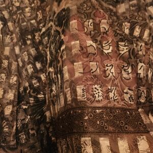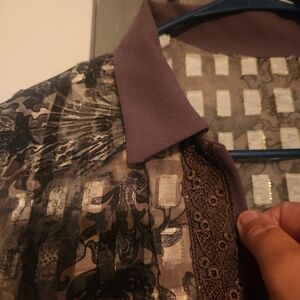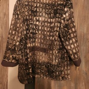 pictures do not do this jacket justice...its silky,soft ,sheer and the colors are amazing..it is the perfect jacket to pair with a cute black dress..or a cute tank top and jeans..you can't tell in the pictures but it shimmers with gold thread throughout..and the cole is green and brown