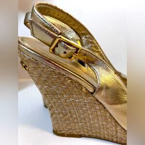 Lilly Pulitzer Kristin Leather Wedge Gold Peep Toe Preppy Shoes Size 8.5