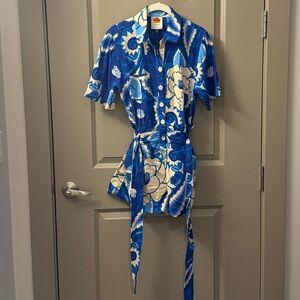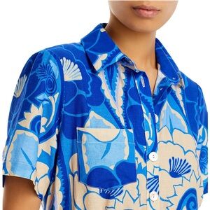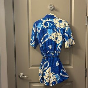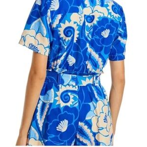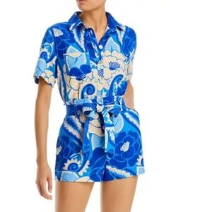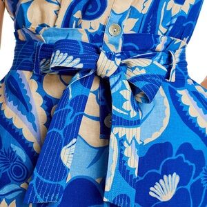 Farm Rio's Tropical Groove romper features a collared short-sleeve silhouette crafted of a floral linen blend. A paperbag waistband with a matching self-tie belt defines the look.