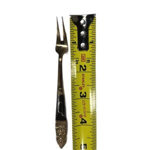 Relish fork, oyster spoon, tiny spoon (tea/coffee?)Lot of vintage mid century Siam flatware serving pieces. They are brass with wood (probably teak) handles.