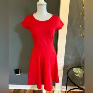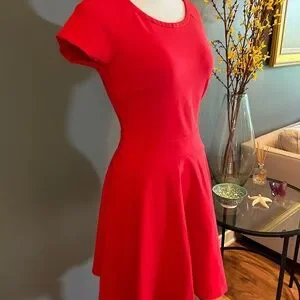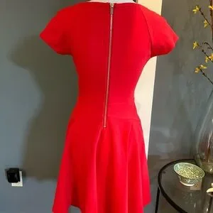 vibrant red dress by designer Diane Von Furstenberg. This size 4 dress has capped sleeves and a silver zipper in the back. The material is stretchy for a flattering fit. This dress measures just over 33 inches from the shoulders to the bottom and 16.5 inches from armpit to armpit. The bottom has a flare style. This dress was only worn once and is in excellent/new condition!