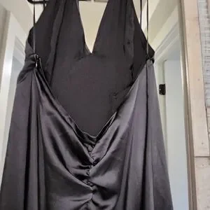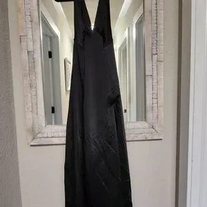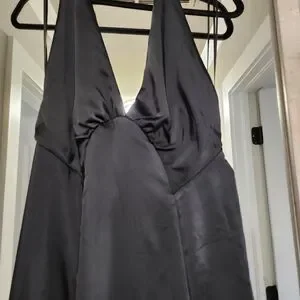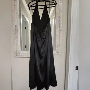 Forever timeless and made for every occasion, this midi is featured in a soft satin fabrication and sleek silhouette with a plunging V-neckline and slit at the leg. **Fit:** Slim-fitting silhouette, midi length **Features:** Soft satin fabrication, plunging V-neckline, flattering seaming throughout, exaggerated leg slit, halter-style with an open back, ruched back detail, lined **Why We ❤ It:** Simple yet chic, this midi is one you'll wear forever