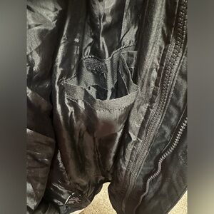 functions as intended and wear is not super noticeable. Includes both the liner and shell. Shell zips into the liner. Hooded. Perfect for winter and skiing or snowboarding.
