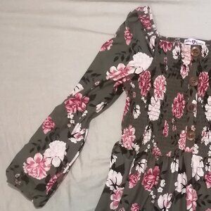 This listing is for a girl's dress made by Bella and Birdie. The dress is sage green with a pattern of pink roses. The bodice features smocking and decorative (non-functional) wooden buttons. The three-quarter length sleeves have thin elastic at the open end. Dress is made of 92% Polyester, 8% Spandex and has a very soft feel. Sized "XL 14-16" Keywords/Style Tags: 3/4, three quarter, peasant, boho, smocked, smocking, floral, roses, complementary colours, soft, super soft, spring, fall, school, Canada, Canadian brand, cottagecore