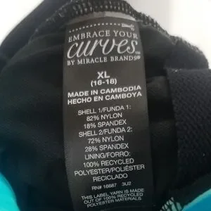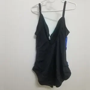 Swimsuit with black and lovely blue fabric. The blue has several layers. Between them, it is mostly polyester and nylon, with some spandex.
