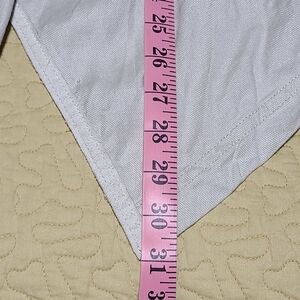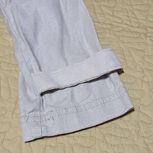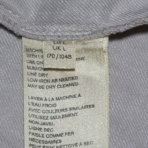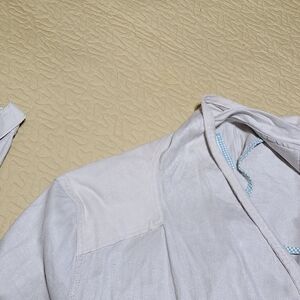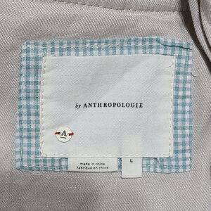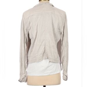 Anthropologie Linen Open Front asymmetrical jacket. Beige open front style with collar and 2 front pockets and button strap closure sleeves. Size L in excellent used condition.