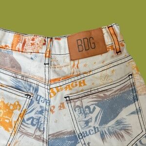 Fun, vintage-inspired Urban Outfitters shorts that you're bound to get compliments on! Print that includes ocean, palm leaves, surfers, guitar or ukulele, text including "Malibu". Tag says "pitched waist short" style