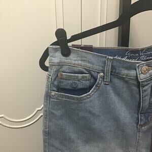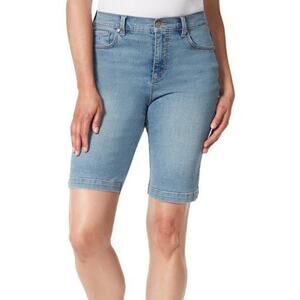 The Amanda stretch denim bermuda shorts by Gloria Vanderbilt provides comfort, style, and a flattering fit. These shorts feature a casual 5-pocket styling, classic light wash solid color design, a side split hem detail on both sides, a single button waist closure, and mid-rise styling. Inseam approx. 9 in. Waist approx. 28 in. Length approx. 19 in.