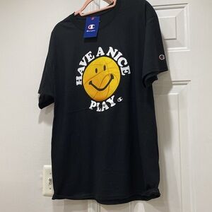 NWT. Champion, men’s size XL, T-shirt. This is a must have for any basketball/sports fan! 100% cotton. Black t-shirt with yellow/orange basketball/smiley face design. Quote reads: “Have a Nice Play”. Champion logo patch on left sleeve. New, with tag. Stored in smoke-free home.
