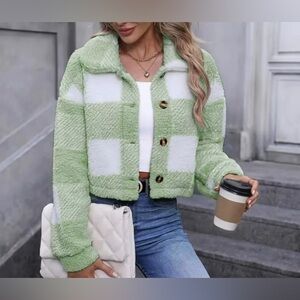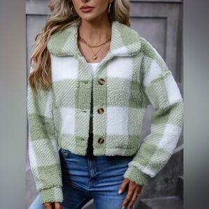 New Teddy Plaid Mint Green White Coat Button Front Long Sleeve Outerwear NWT Crooped