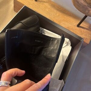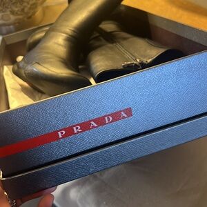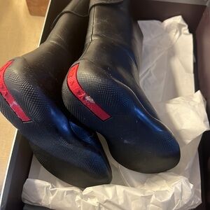 Girls black Prada Boots with round toe, rubber sole and zip closure at side.