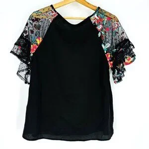 Chic black floral top with intricate embroidery and tiered ruffle sleeves. Perfect for casual or dressy occasions.
