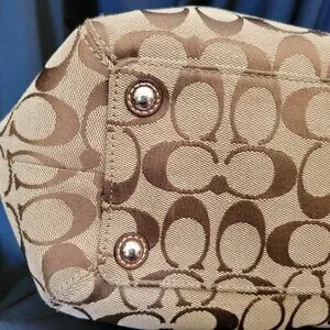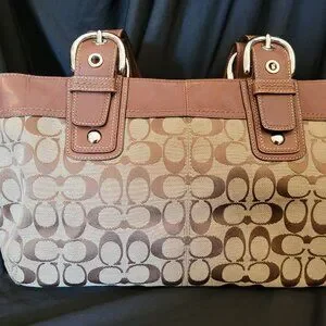 This bag is a beautiful genuine Coach Shoulder tote with a pleated signature front and leather handles with silver hardware. Feels amazing on your shoulder, with a surprising amount of room! Top zips, size expands, inner has one zip pocket and two open pockets on the other inner side. Approx 16x8x6. Handles have 10 inch drop. Please see pictures for all details! This is the perfect bag to match your favorite brown boots.