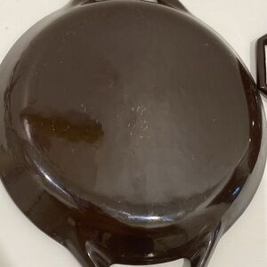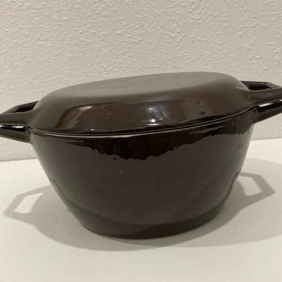 It was designed by Michael Lax by Copco Denmark and is marked Copco, Denmark D2 on the bottom. The dutch oven is 8.25" wide without handles and 10.5" in width including the handles, and 4" high without the top ,and 5" in height with