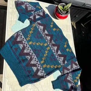 Vintage 80s / 90s Hi Yu funky knit sweater. Awesome retro leather-like details on the front. 100% acrylic, tagged as a size medium. Measures 23" across shoulders, 23" pit to pit, 25.5" long.