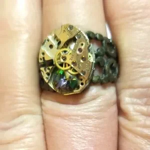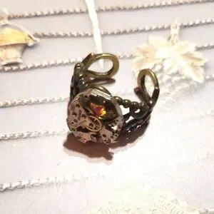 Unique, One of a kind, Hand Crafted Steampunk Ring with Watch parts that has real small teeny Ruby jewels and a Rainbow Crystal that flashes different colors at the slightest movement. The band is Filigree Brass. It's adjustable and should fit most sizes. A great conversation piece !