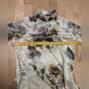 This exquisite, one-of-a-kind vintage piece from the '90s is sure to become to star of your wardrobe. Halfway between a kimono (but w fitted sleeves) and a dress, it is open up both sides with slits to the waist, and fastens with snaps across the chest and up the collar. It's almost like a kimono-inspired vest, but with sleeves, if that makes sense. There are so many ways to wear this lovely piece, and it needs a good home!