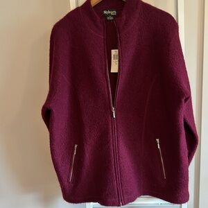 Gorgeous roomy luxurious wool in deep burgundy. Zipper closure cardigan and zipper pockets. Thick tight boucly knit. Lovely detailing. New with tags. Some natural variation in wool and knit. Very pretty and warm! Bundle up! ๐๐๐