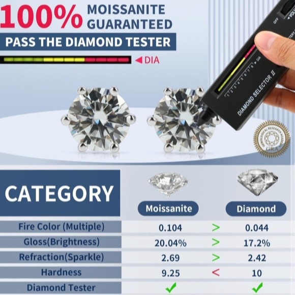 Moissanite scores 9.25 on the Mohs Scale of Hardness. That makes it the hardest gemstone used in jewelry next to diamonds (which is a 10). Sparkle wise, moissanite has an even higher refractive index than diamonds, so it's even sparklier than a diamond. Moissanite can also resist heat just as well as diamond