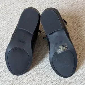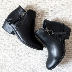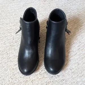 black ankle boots with heels, zippers on both sides, but only the interior ones are functional. bought new, but I didn't know they ran a whole size smaller. they say size two but they fit like a size 1.