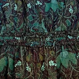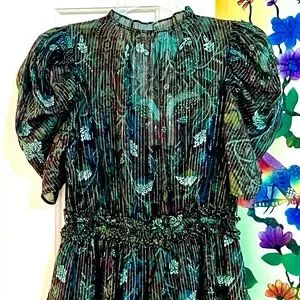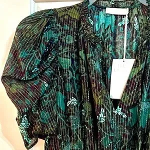 Flaunting the romantic Ulla Johnson boho aesthetic, the gorgeous Ada Mini Dress is designed with ultra feminine puffed sleeves & a mesmerizing leaf print in lightweight crinkled chiffon, accented with shimmering metallic thread. An exquisite dress perfect for all occasions. Featuring a split v-neckline with self-tie closure, smocked elasticized waistband, hidden side seam pockets & ruffle trim & hem. Shell 56% cotton, 42% viscose, 2% metallized polyester. Lining 100% polyester. Approximate size measurements will be posted soon. Size 2 is NWT, brand new with tags.