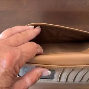 Twelve credit slots and one slot for ID with plastic cover. One slot behind the bottom of trifold and two slots behind middle trifold.