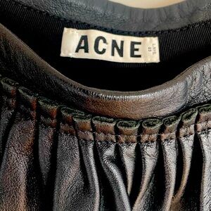 This is a beautiful Acne Studios pleated leather skirt with a denim band at the hem. Beautiful craftsmanship in the sewing, pockets, lined. Definitely a wardrobe, staple for the right person. Fits a size 8 to 10.