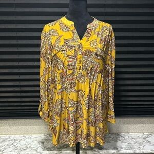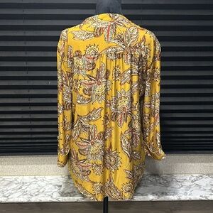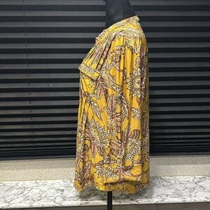 Cocomo women’s gold with red print blouse. 3/4 button cuff sleeve. Button v-neck. Collarless. Size Large