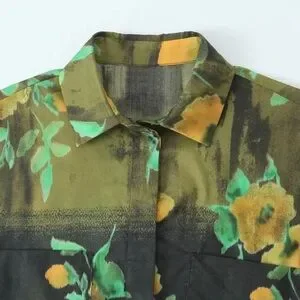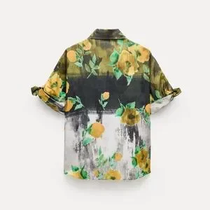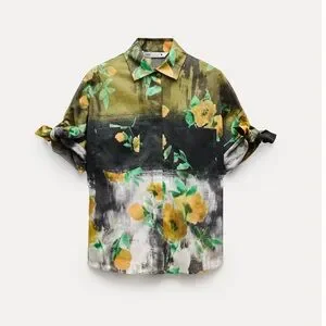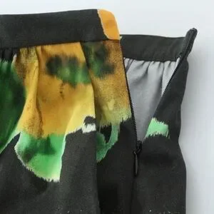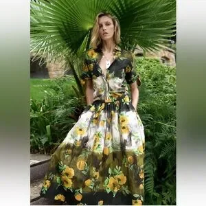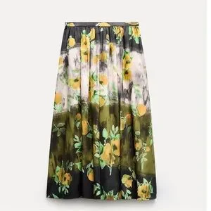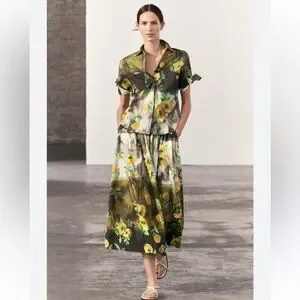 ZARA ZW WOMAN COLLECTION 2pc Co Ord Set Midi skirt & Button Down Blouse Size Medium NWT Highly Sought after! Floral black/yellow/green