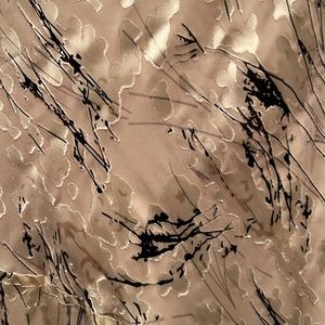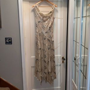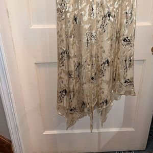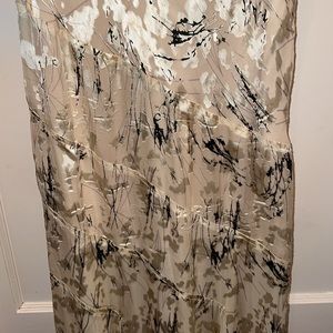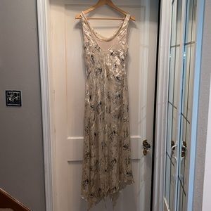 This is a stunning dress. It has hidden splits at bottom to allow for movement like dancing. It is a viscose and silk blend material. Bustline 40”, waist 32”, length 56”. In good condition, no stains tears etc.