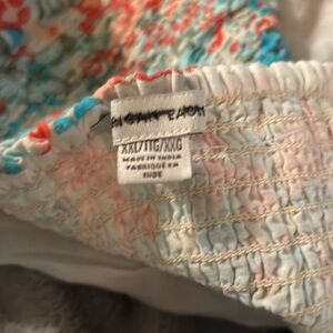 NWOT Halter Crop Top, in XL or XXL, floral pattern in pastel & brighter shades of blue, pink, green, and strawberry red, adjustable halter neck with self tie, ruched center seam & paneling along bust, ruffle trim and smocked elastic back, no stretch in bust