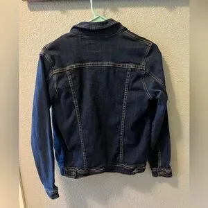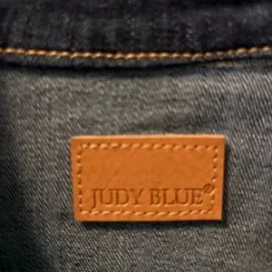 Judy Blue denim jacket, size small. This is a heavier jacket. Only worn a couple times. Please noticed spot on sleeve in photo. Seems to be a pulled string or scratch, I don’t even notice it until taking photos. Not a hole, just looks like a little distressed spot.