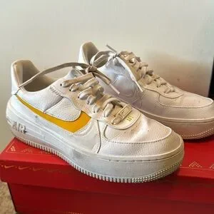 Nike yellow swoosh Air Force ones, one lace missing the plastic as the end otherwise gently used and still great!