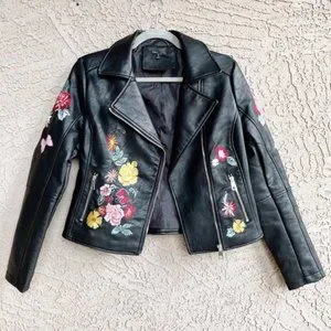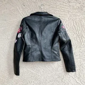 Black faux leather moto biker jacket with floral & butterfly embroidery. Excellent Condition—looks new.