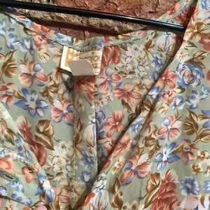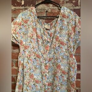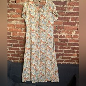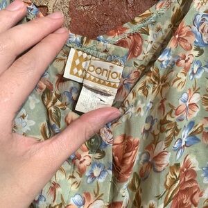 Floral print dress with a tie in the back and some alterations to fit smaller. Flowy boxy fit and can fit a variety of sizes due to tie. From Bonjour, tagged a M but could probably fit xs-xl
