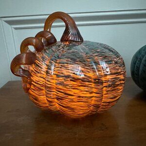 Pier 1 Illuminated Art Glass 7" Halloween Pumpkin Blue Black Swirl Curly Stem