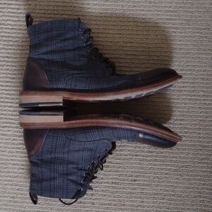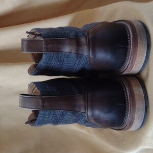 Grey & black plaid uppers with dark brown leather toe caps and heels.