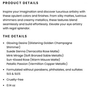 Inspire your imagination and discover luxurious artistry with these opulent colors and finishes. From silky mattes, lustrous shimmers and creamy metallics, these textures blend seamlessly and build effortlessly. Elevate your eye artistry with regal splendor.