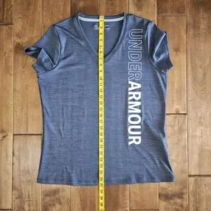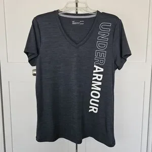 Under Armour NWOT women's size Large charcoal gray loose fit heatgear v-neck t-shirt with white/light gray graphic